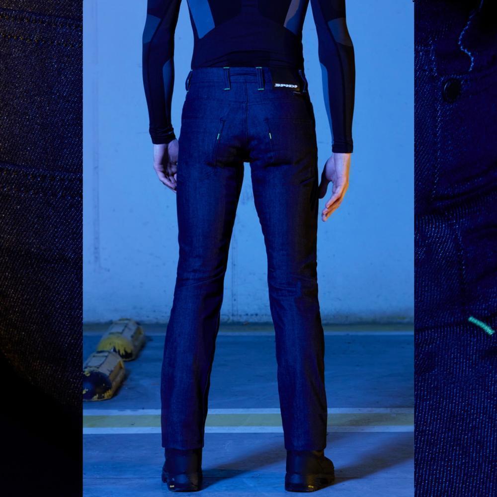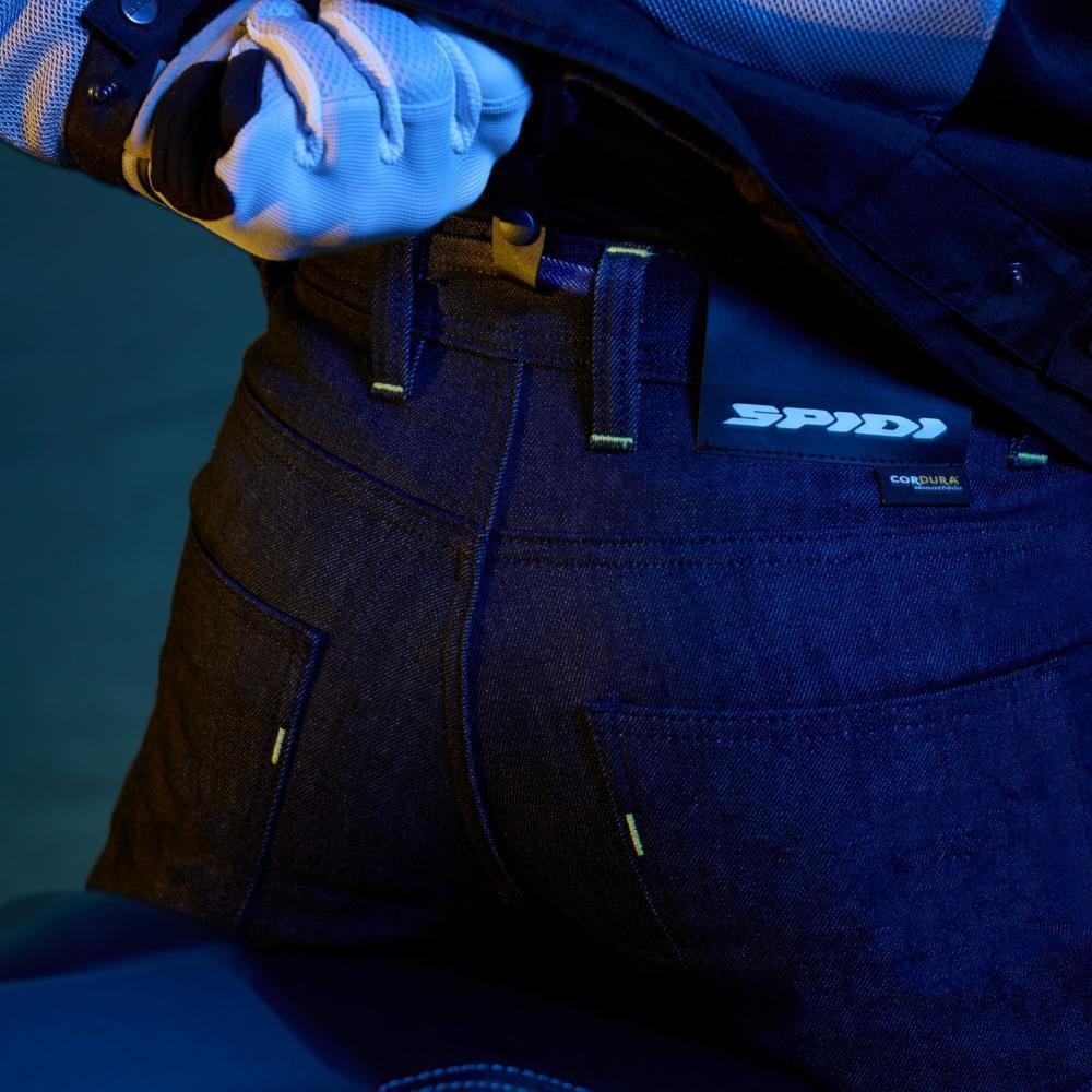 Джинсы оснащены съемными и регулируемыми по высоте протекторами коленей уровня 2 Warrior Lite, кнопкой для крепления брюк к куртке и культовым металлическим кольцом для ключей SPIDI.